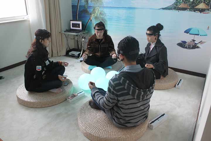 首先,放松冥想室的布置是多么的温馨舒适啊!房间主色调为干净的蓝绿色,据说蓝色是梦幻般的颜色,最容易使人产生心灵冥想,排除繁杂;小盆栽的绿色植物点缀室内,是那么的清新自然,生命的颜色永远都是快乐的象征;地板使用软材质铺设,如地毯,避免走路的声响影响放松效果;几个圆圆的大垫子摆在地上,围成一圈,天然藤草编做,散发质朴自然气息,清凉舒适,大家盘腿而坐,实在是很有意思;播放由放松音乐、自然声音、放松冥想指导语等组成的专业放松音乐。室内没有其他的杂物,一切都是令人觉得那么的温馨舒适。可以说,每一个细节都体现了设计者的良苦用心!